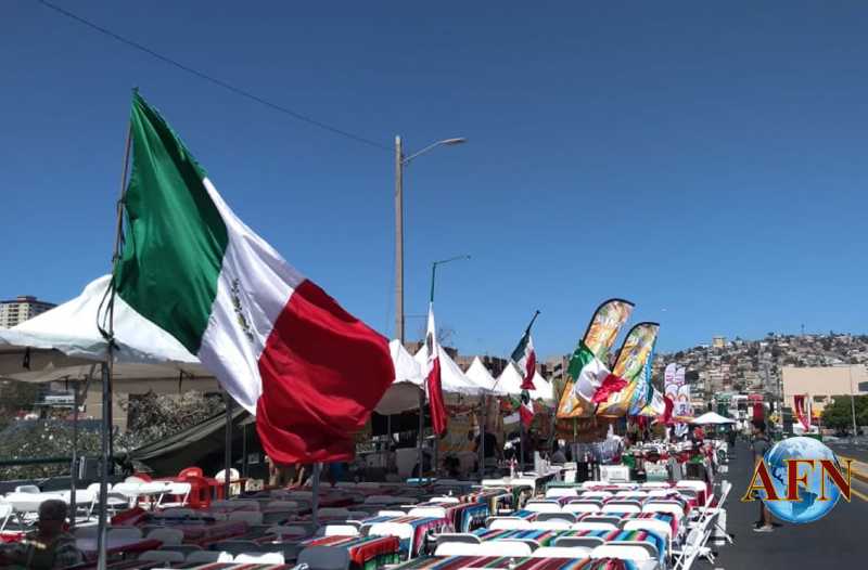 TIJUANA BC 15 DE SEPTIEMBRE DE 2018 (AFN).- Esta tarde, hasta las 14:30 horas, seguían los preparativos para el festejo patrio del "Grito de la Independencia", sobre el puente frente a palacio municipal, donde comerciantes han instalado puestos de antojitos mexicanos, entre otros artículos y bebidas.