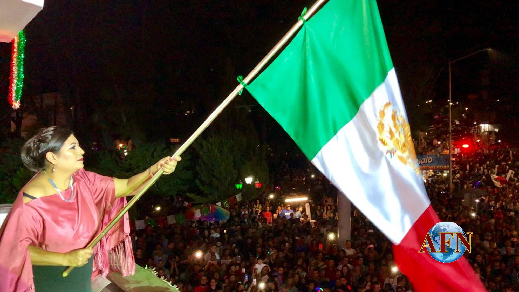TECATE BC 16 DE SEPTIEMBRE DE 2018 (AFN).- Más de 25 mil tecatenses se congregaron en la explanada del tradicional Parque Miguel Hidalgo y sus alrededores, donde la alcaldesa Nereida Fuentes, desde el balcón de la presidencia municipal encabezó el acto solemne para conmemorar el 208 Aniversario del Grito de Independencia de México, en una noche que resultó emotiva en el pueblo Mágico de Tecate.