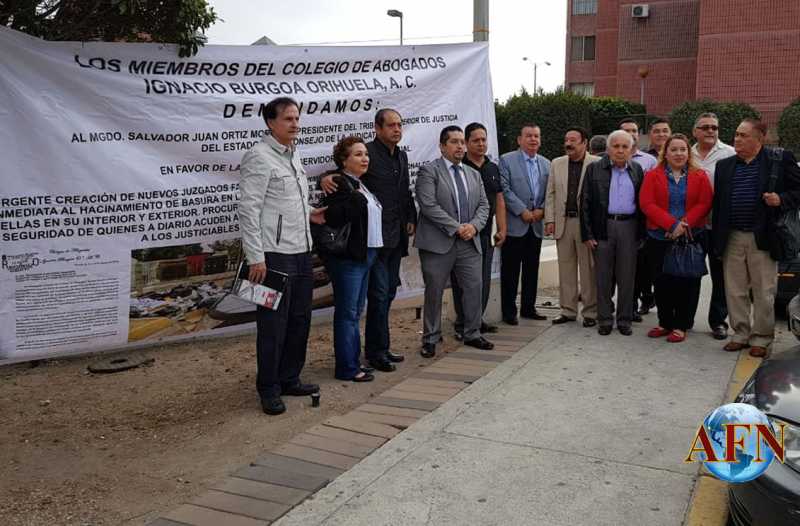 TIJUANA BC 28 DE SEPTIEMBRE DE 2018 (AFN). – Cansados de solicitar durante varios años inútilmente la apertura de más juzgados, integrantes del Colegio de Abogados Ignacio Burgoa Orihuela colocaron esta mañana una manta en el edificio de juzgados civiles exhibiendo sus desatendidas demandas, para que se resuelvan un sinnúmero de rezagos que afectan a litigantes y usuarios del Poder Judicial.