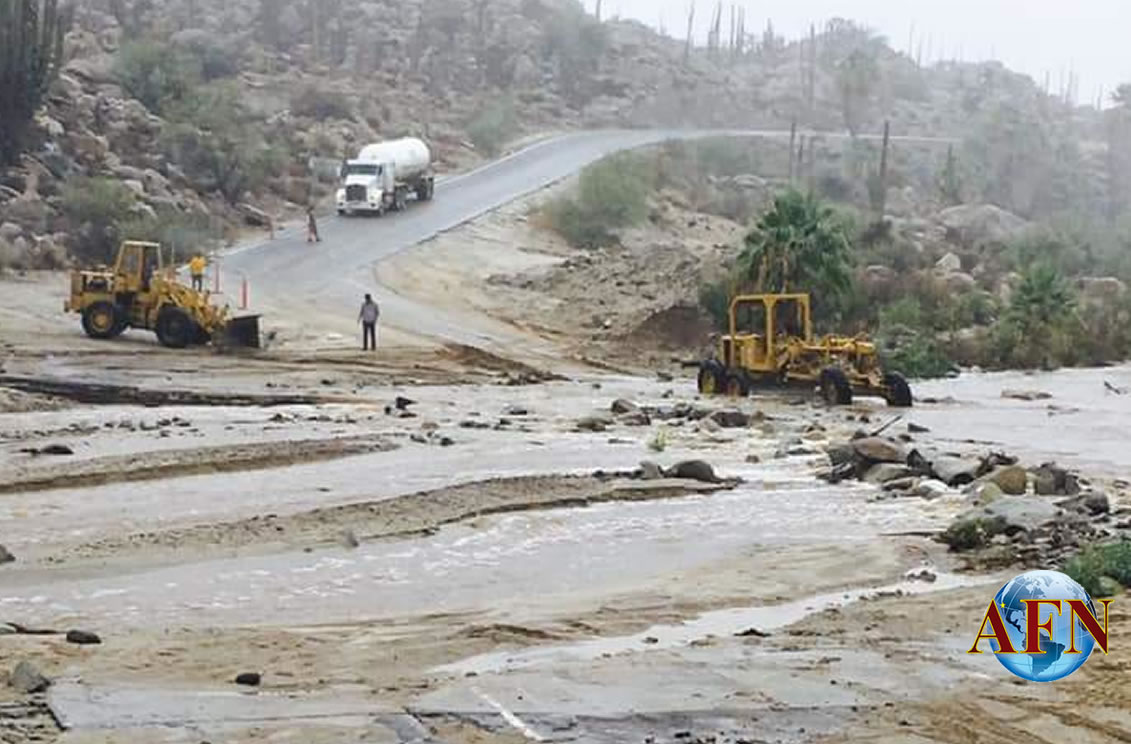 La Secretaría de Comunicaciones y Transportes (SCT) informó que en el poblado de Cataviña, en el kilómetro 177 y 179 de la carretera Transpeninsular, en la vía Lázaro Cárdenas-Punta Prieta, los vados quedaron inundados por la crecida del arroyo; el paso está abierto únicamente para vehículos pesados y en las carreteras federales esperan restablecer la comunicación en las siguientes horas.