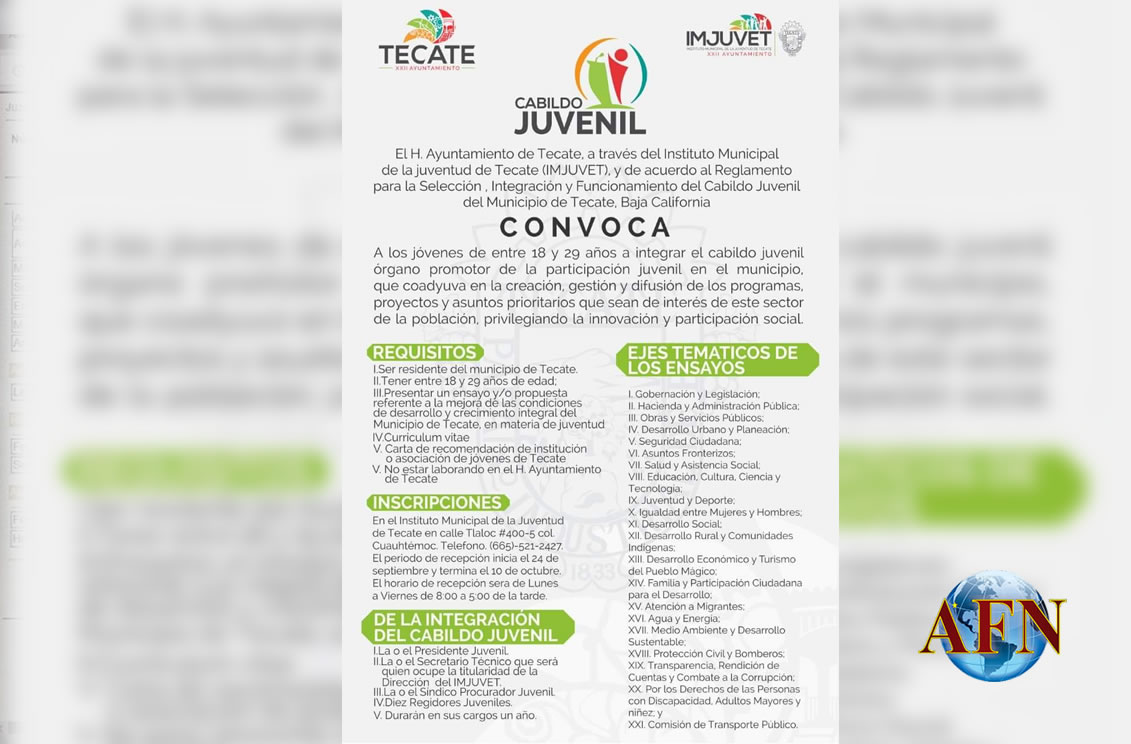 TECATE BC 3 DE OCTUBRE DE 2018 (AFN).- El Gobierno Municipal de Tecate a través del Instituto Municipal de la Juventud (Imjuvet), abrió convocatoria para que jóvenes de entre 18 y 29 años de edad apliquen para integrar el primer Cabildo Juvenil de Tecate.