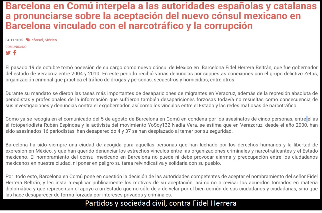 MÉXICO DF 5 DE NOVIEMBRE DE 2015 (La Silla Rota).- La coalición política Barcelona en Comú, plataforma a la que pertenece Ada Colau, alcaldesa de Barcelona, emitió un comunicado este miércoles cuestionando al gobierno español por aceptar el nombramiento de Fidel Herrera como cónsul en esta ciudad.