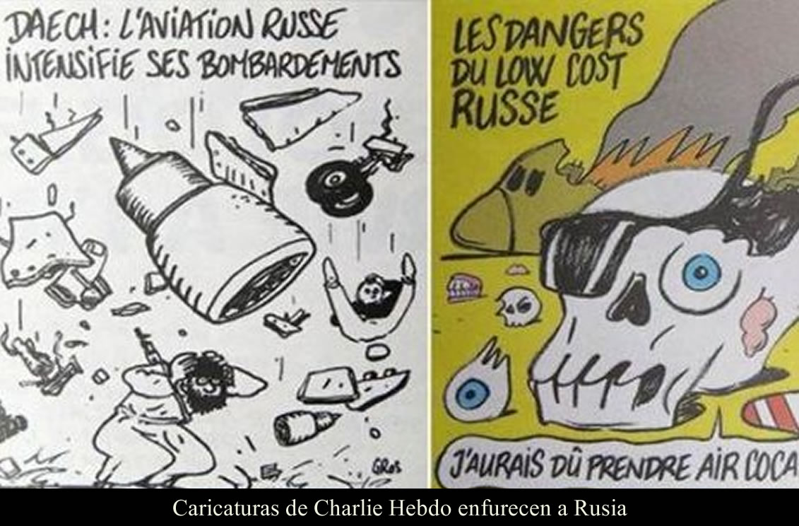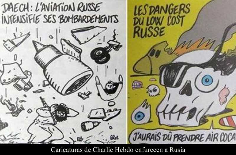 FRANCIA 7 NOVIEMBRE DEL 2015 (La Silla Rota).- Aún no se define si la caída de un avión ruso de Metrojet en el Sinaí egipcio el pasado sábado, fue un atentado terrorista, sin embargo, la revista satírica francesa Charlie Hebdo, que fue el año pasado objeto de un ataque yihadista, publicó dos caricaturas de la tragedia que le costó la vida a 224 personas, lo que desató la molestia en Rusia.