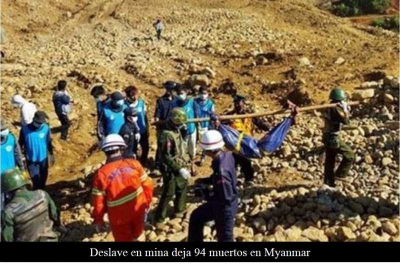 Autoridades de Hpakant, a unos mil 100 kilómetros al norte de Rangún, la antigua capital birmana, informaron este domingo que los equipos de rescate han logrado recuperar al menos 94 cuerpos, aunque las labores de búsqueda continúan.