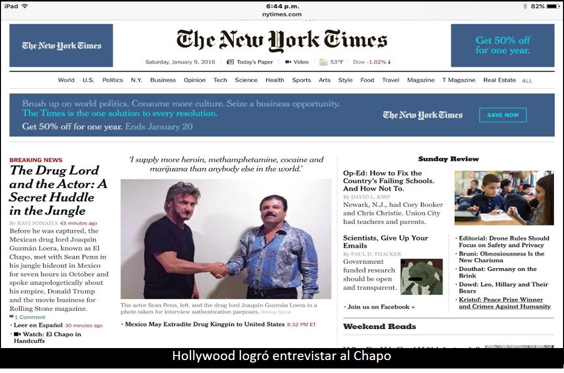 TIJUANA BC 9 DE ENERO DE 2016 (AFN).- La entrevista e historia bibliográfica de la que la Procuraduría General de la República anunció fue una de las razones por la que Joaquín el "Chapo" pudo ser capturado la madrugada del 8 de enero pasado, realizada por el actor norteamericano Sean Penn y la actriz mexicana Kate del Castillo en octubre del año pasado en un sitio fuertemente resguardado por más de cien sicarios del narcotraficante.