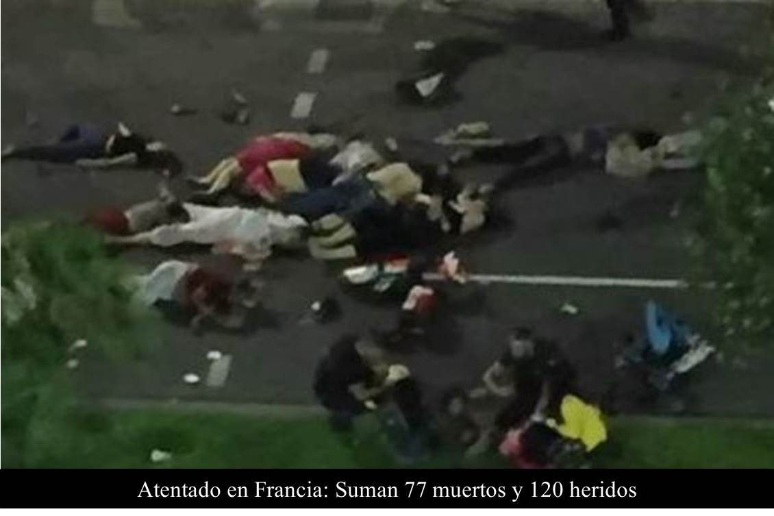FRANCIA 14 DE JULIO DE 2016 (La Silla Rota).- Un camión atropelló a una multitud en Niza, Francia, y se habla de al menos 77 muertos y 120 heridos, 15 de ellos se encuentra en extrema gravedad. El incidente ocurrió cuando se desarrollaba el desfile para celebrar la toma de La Bastilla.