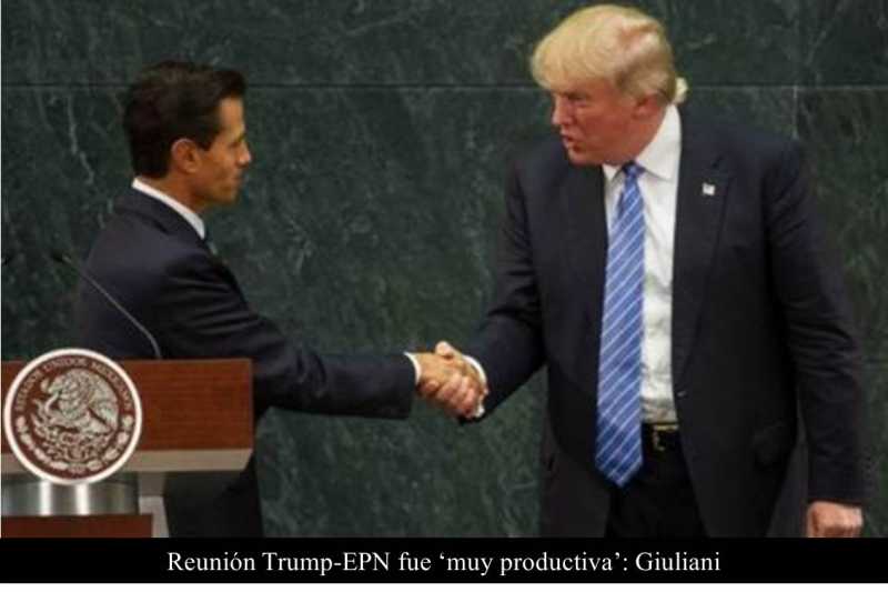 ESTADOS UNIDOS 4 DE SEPTIEMBRE DE 2016 (La Silla Rota).- Rudolf Giuliani, ex alcalde de Nueva York, indicó que la reunión entre el candidato presidencial republicano Donald Trump y el presidente Enrique Peña Nieto fue “muy buena” y “muy productiva”, y encontraron áreas de acuerdo.