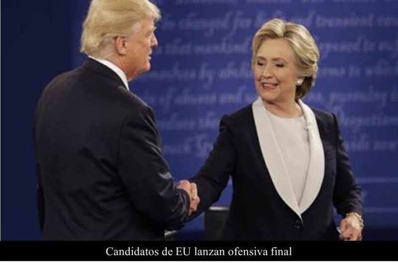 ESTADOS UNIDOS 6 DE NOVIEMBRE DE 2016 (La Silla Rota).- A dos días de las elecciones, los candidatos Hillary Clinton y Donald Trump ajustaron su ofensiva final a media docena de estados “campos de batalla” para buscar perforar sus respectivos muros de apoyo azul y rojo hasta el último minuto antes del voto.