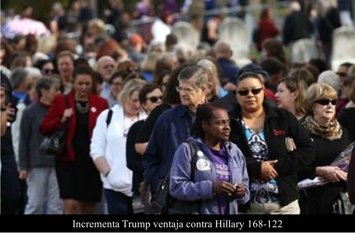 MÉXICO 8 DE NOVIEMBRE DE 2016 (La Silla Rota).- A las 21:30 horas, Donald Trump ganaba Ohio y con sus 18 votos electorales ampliaba su ventaja de votos electorales en 168, en tanto que Hillary Clinton ganaba Virginia, con loque sumaba 122 votos electorales.