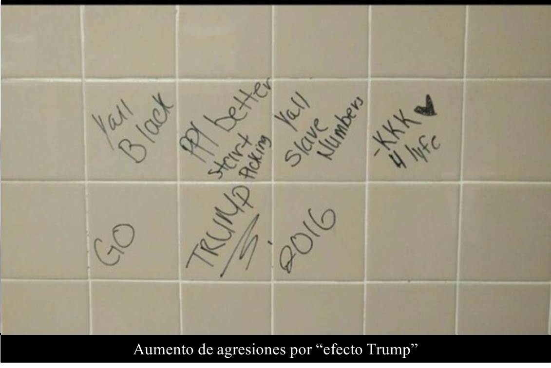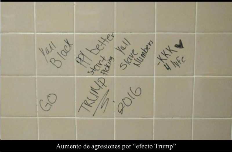 Una madre que no se identificó compartió el siguiente mensaje: “Niños simpatizantes de Trump agredieron a mi hijo. Lo llamaron mexicano estúpido y le dijeron que apenas si podían esperar el momento en que Trump lo deportara. El maestro dijo que si respondía la agresión lo suspendería”.