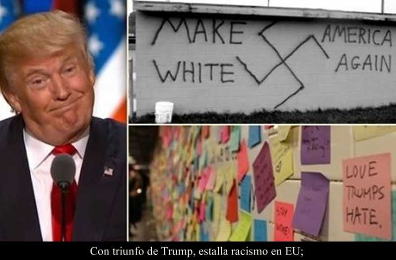 WASHINGTON 19 NOVIEMBRE 2016 (LA SILLA ROTA).- Al menos 300 incidentes raciales o discriminatorios han sido reportados en Estados Unidos desde el triunfo de Donald Trump en las elecciones del 8 de noviembre, de acuerdo con el Centro Legal sobre la Pobreza en el Sur (SPLC).