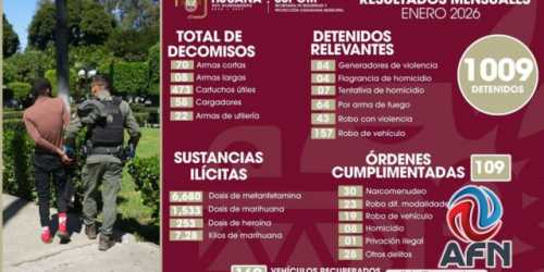 TIJUANA BC 2 DE FEBRERO DE 2026 (AFN).- Durante el mes de enero fueron decomisadas 78 armas de fuego y detenidas mil nueve personas presuntamente relacionadas ...