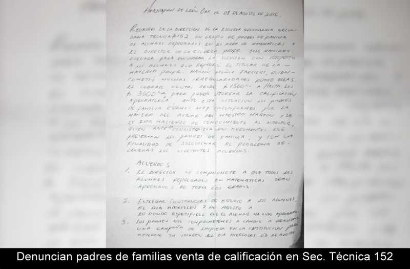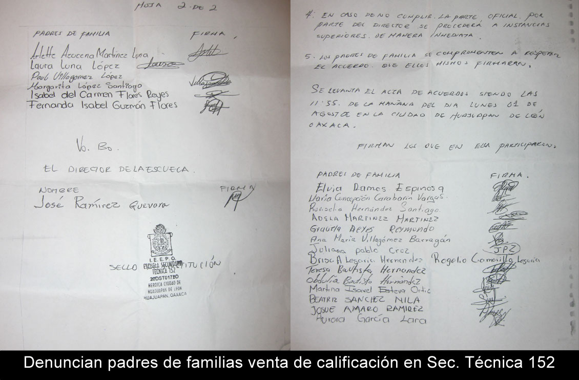 En seguida aparecen nombres y firmas de 20 padres de familias que sustentan los puntos de acuerdo, pero a nuestros días el titular de la materia de matemáticas no ha cumplido con tales acuerdos de otorgar a los alumnos reprobados la calificación de aprobados, sino que hasta que paguen la cantidad de un mil 500 pesos a tres mil pesos.