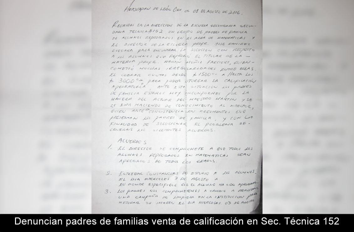 Heroica Ciudad de Huajuapan de León, Oaxaca, México. 5 de Agosto 2016.- Un grupo de 20 de padres de familias de la Escuela Secundaria Técnica número 152, afiliada a la sección 22 del Sindicato Nacional de Trabajadores de la Educación (SNTE), denunciaron la venta de calificaciones por parte del profesor Martín Muñiz Farciet, titular de la materia de matemáticas, por una cuota que va desde un mil 500 pesos, hasta tres mil pesos, por calificación aprobatoria a los alumnos que a propósito reprobó en su materia.