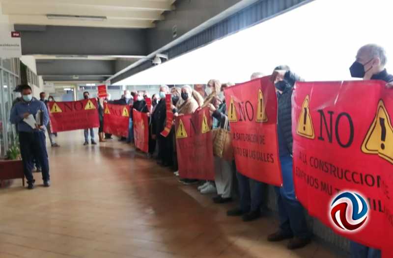 Acompañados de su abogado, Juan Marcos Gutiérrez, los manifestantes se apostaron al exterior de la oficina de presidencia municipal, donde explicaron que en la zona donde residen se lleva a cabo la edificación de multifamiliares y una plaza comercial.