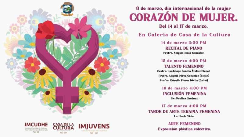 ENSENADA BC 13 DE MARZO DE 2022 (AFN).- Del día 14 al 17 de marzo el Instituto Municipal de Cultura y Desarrollo Humano de Ensenada presentará el programa cultural denominado “Corazón de Mujer”, en el marco de las actividades por el Día Internacional de la Mujer que se conmemora el 8 de marzo.