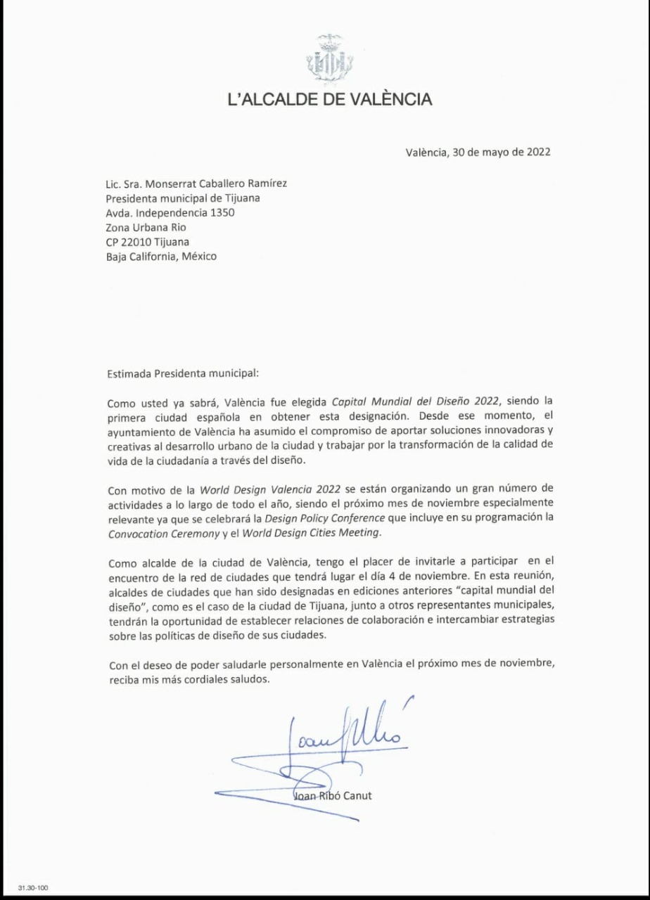 La presidenta municipal fue invitada por su homólogo el alcalde de Valencia Joan Ribó Canut, quien la convocó para que participe en dichas actividades entre las que destaca la “Design Policy Conference”, que incluye este encuentro y formalización de una red de ciudades que serán nombradas Capital Mundial del Diseño.
