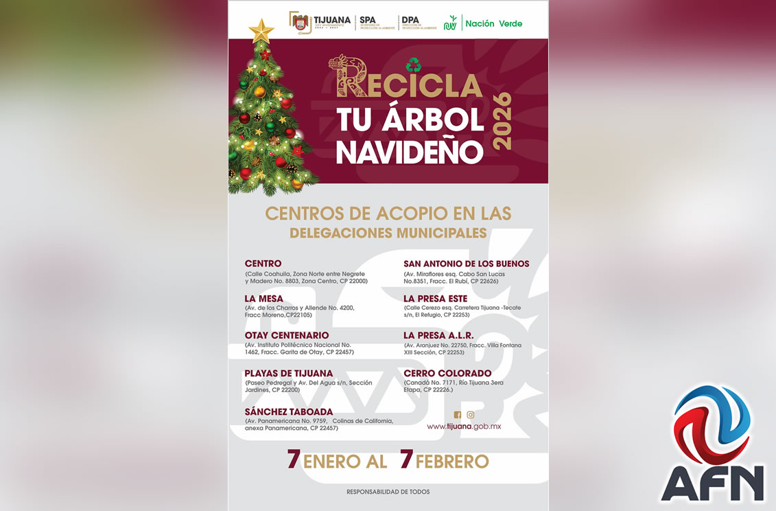 TIJUANA BC 7 DE ENERO DE 2026 (AFN).- Se habilitaron centros de acopio en las nueve delegaciones de Tijuana para que la ciudadanía pueda depositar sus árboles navideños naturales y evitar que sean abandonados en la vía pública, como parte de la campaña "Recicla tu Árbol Navideño 2026", informó la titular de la Secretaría de Protección al Ambiente (SPA), Fernanda Sandoval Aldana.