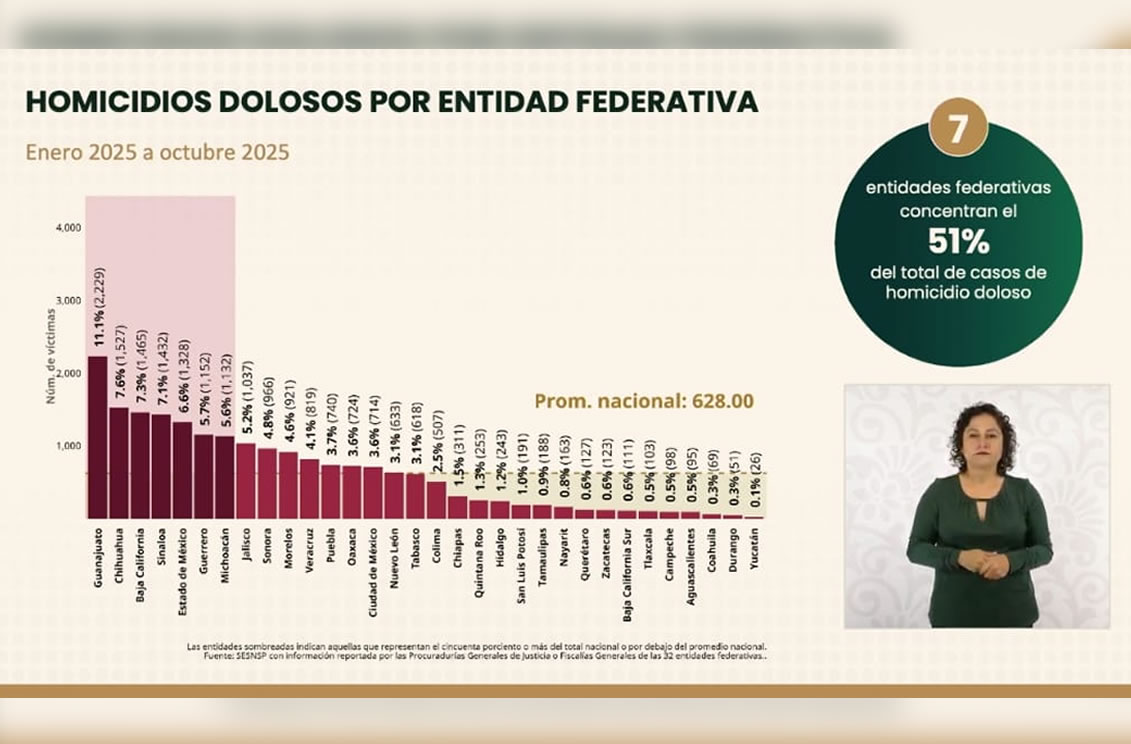 Agregó las cifras al cierre del mes de octubre de 2025, donde Baja California se ubicó en cuarto sitio a nivel nacional (después de Chihuahua, Guanajuato y Sinaloa) con 121 homicidios dolosos, el 7.2% del promedio nacional.