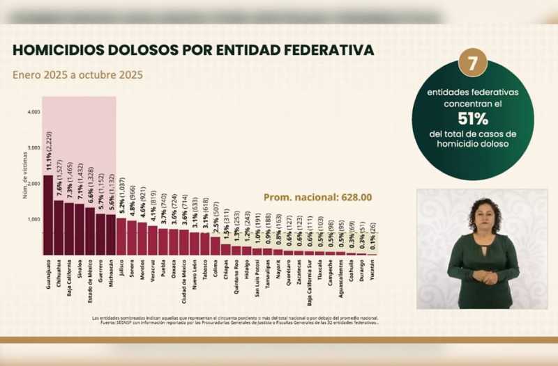Figueroa Franco destacó lo anterior, durante su participación en la conferencia matutina de la presidenta Sheinbaum Pardo, quien expuso un reporte sobre resultados de los indicadores del mes de octubre de 2025, comparando las cifras de homicidios por años y en diversos periodos y entidades.