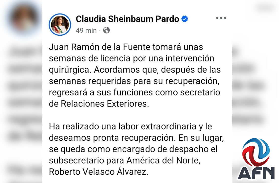 TIJUANA BC 28 DE NOVIEMBRE DE 2025 (AFN).- La presidenta Claudia Sheinbaum Pardo anunció hoy, que el titular de la Secretaría de Relaciones Exteriores (SRE), Juan Ramón de la Fuente, tomará algunas semanas de licencia, ya que será intervenido quirúrgicamente.