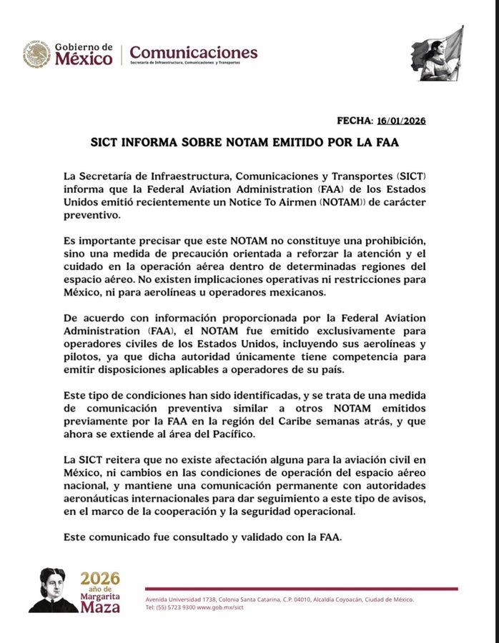 “Es importante precisar que este NOTAM no constituye una prohibición, sino una medida de precaución orientada a reforzar la atención y el cuidado en la operación aérea dentro de determinadas regiones del espacio aéreo. No existen implicaciones operativas ni restricciones para México, ni para aerolíneas u operadores mexicanos”, precisó el comunicado de la SICT.