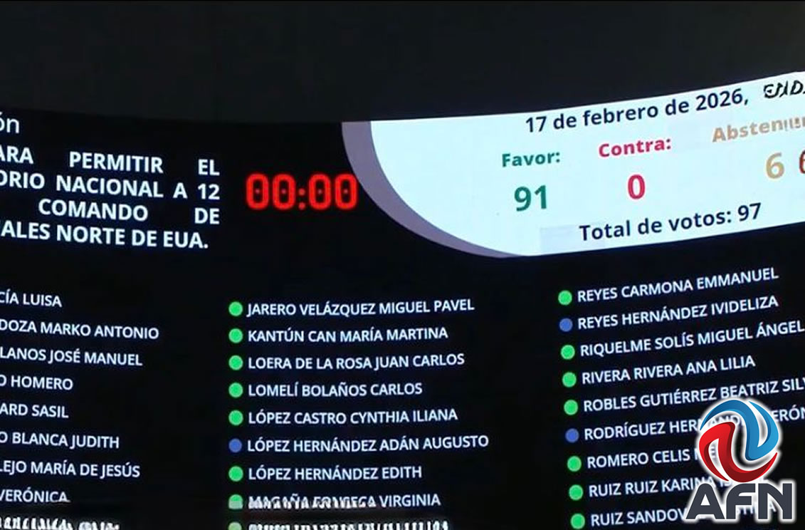 CIUDAD DE MÉXICO CDMX 17 DE FEBRERO DE 2026 (AFN).- Con 91 votos a favor y seis abstenciones, el Pleno del Senado concedió la autorización a la presidenta Claudia Sheinbaum para permitir el ingreso de 12 militares de Estados Unidos, para participar en el ejercicio SOF1 Capacitación MEXSOF (Defensa), del 27 de febrero al 15 de julio.
