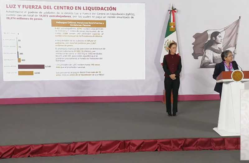 En la conferencia partició la titular de la Secretaría Anticorrupción y Buen Gobierno, Raquel Buenrostro, quien expuso que en el caso de Luz y Fuerza del Centro hay poco más de 14 mil extrabajadores de confianza que representan un gasto anual de 28 mil millones de pesos, de los cuales 9 mil 457 reciben pensiones mensuales de entre 100 mil y un millón de pesos; además de exponer que, de dicho organismo, se subsidia parcialmente el impuesto sobre la renta a jubilados, lo que implica 2 mil 400 millones de pesos adicionales al año.