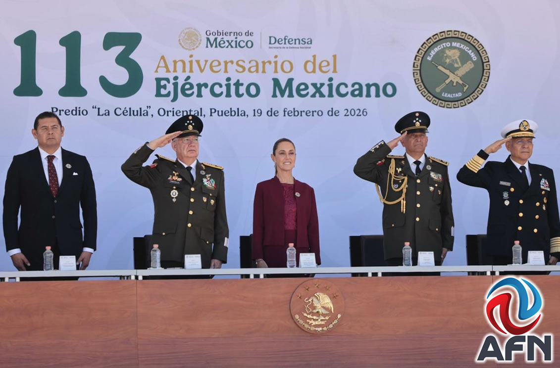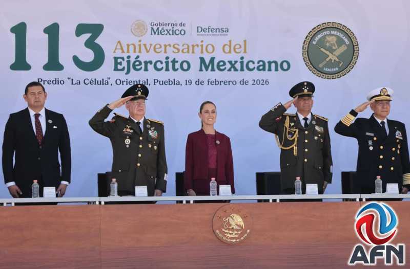 CIUDAD DE MÉXICO CDMX 19 DE FEBRERO DE 2026 (AFN).- La presidenta Claudia Sheinbaum Pardo encabezó la ceremonia por el 113 aniversario del Día del Ejército Mexicano en el municipio de Oriental, Puebla, en las instalaciones de la Dirección General de Industria Militar.