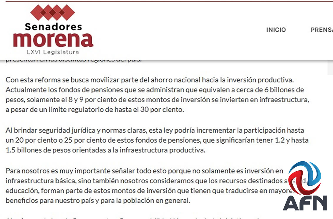 CIUDAD DE MÉXICO CDMX 7 DE ABRIL DE 2025 (AFN).- El partido Morena presentó una propuesta de reforma constitucional, que permitiría, de ser aprobada, el uso de un 30% del total de los ahorros de las Afores para la construcción de mayor infraestructura en el país.