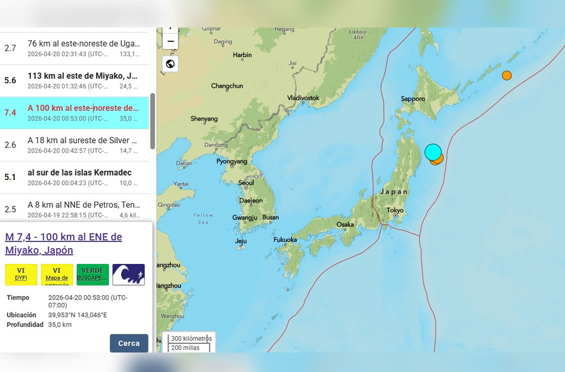 CIUDAD DE MÉXICO CDMX 20 DE ABRIL DE 2026 (AFN).- Esta madrugada, a las 00:53 horas, horario de Tijuana, Baja California, un terremoto de magnitud 7.4 grados sacudió la costa Noreste de Japón, frente a la región de Sanriku, lo que provocó la activación inmediata de alertas de tsunami y evacuaciones preventivas en varias zonas costeras.