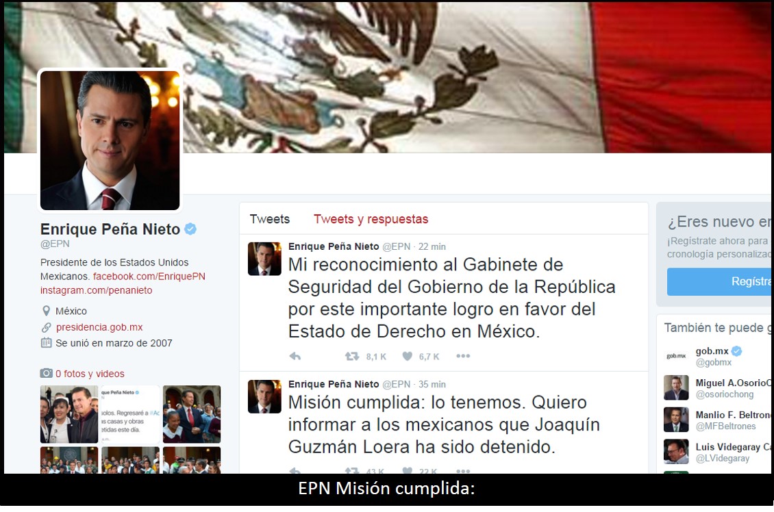 La noticia la dio a conocer el presidente Enrique Peña Nieto en su cuenta de Twitter: “Misión cumplida: lo tenemos. Quiero informar a los mexicanos que Joaquín Guzmán Loera ha sido detenido”.