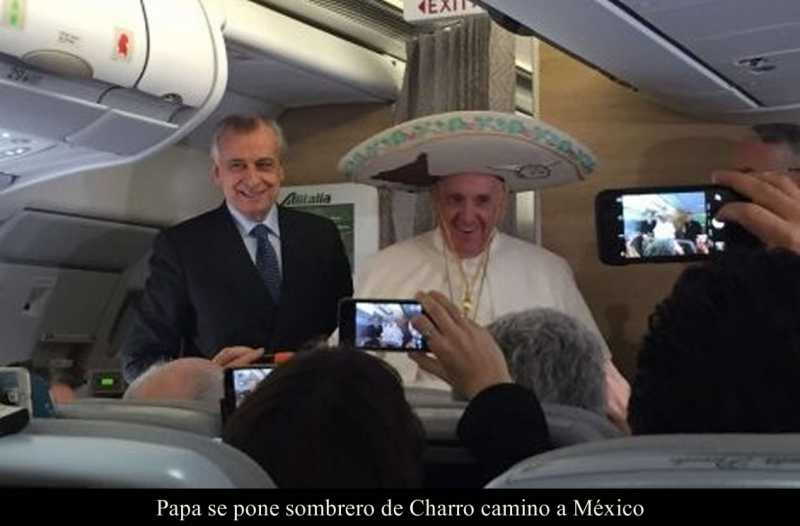 MÉXICO DF 12 DE FEBRERO DE 2016 (LA SILLA ROTA).- El Papa Francisco se divirtió hoy poniéndose un sombrero de charro, dedicando libros, recibiendo cartas y regalos varios, haciendo bromas sobre el futbol argentino, tomándose autofotos y escuchando mensajes de gente común.