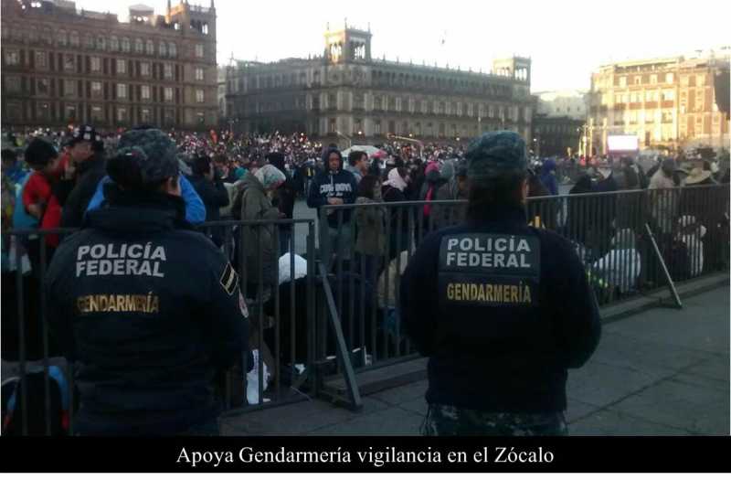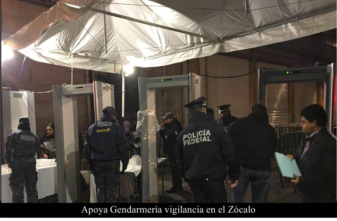 Desde las 02:00 horas en que se abrió el acceso a quienes ingresaron a las gradas instaladas en el Zócalo, el personal de Gendarmería daba la bienvenida, les informaba sobre las medidas de seguridad y protección civil, además de efectuar la revisión de aquellas personas que portaban bolsos o mochilas, se informó.