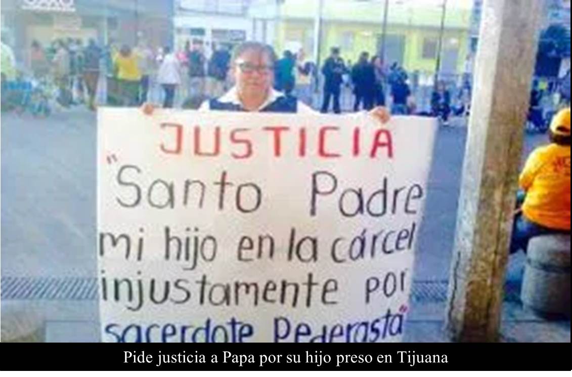 “Justicia. Santo Padre: mi hijo en la carcel injustamente por sacerdote pederasta. Tijuana”, es el mensaje que trata que mire el Papa, a quien desea entregarle una carta donde le explica la situación clerical que prevalece en Tijuana y este caso judicial.