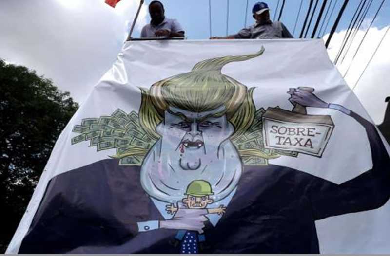 MÉXICO 6 DE MARZO DE 2018 (La Silla Rota).- Este lunes sindicatos brasileños protestaron frente al Consultado de Estados Unidos por las intenciones de Trump de imponer aranceles al acero. (EFE) La amenaza del presidente de Estados Unidos Donald Trump de imponer aranceles de 25% a las importaciones de acero y de 10% al aluminio, recibió de inmediato una enérgica respuesta mundial, incluyendo la advertencia de la Organización Mundial de Comercio (OMC) en el sentido de que una guerra comercial podría llevar a una recesión internacional.