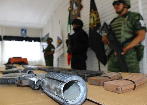 Entre lo asegurado se encuentra: dos lanzagranadas calibre 40 mm, un Uzi color negro, 9mm, una subametralladora color negro, con la leyenda PLR-16 5.56mm y una culata retráctil, de R15