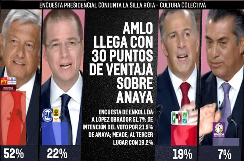 MÉXICO 26 JUNIO 2018 (LA SILLA ROTA).- Si hoy fueran las elecciones a la Presidencia de la República, Andrés Manuel López Obrador (AMLO), candidato de la coalición "Juntos haremos Historia" (Morena-PT-PES) ganaría con 51.7% de los votos, 30 puntos de ventaja sobre el segundo lugar, de acuerdo con una encuesta de ENKOLL patrocinada por LA SILLA ROTA y Cultura Colectiva.