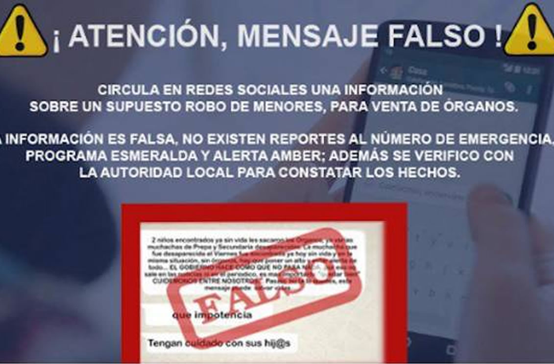 A través de redes sociales han estado circulando cadenas en las que cuentan supuestos casos de niños que fueron raptados, incluso, unos dicen que menores de edad fueron encontrados sin órganos y otros se encuentran desaparecidos. Hechos que son falsos.