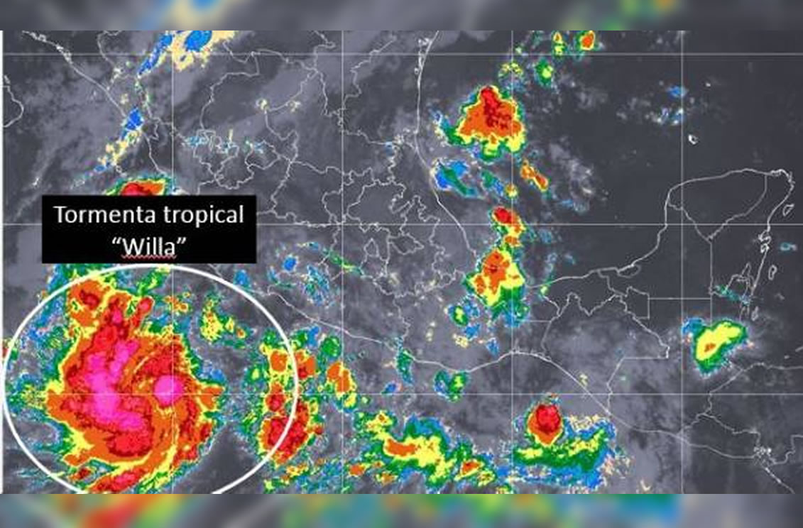 CIUDAD DE MÉXICO 20 DE OCTUBRE 2018 (SDP NOTICIAS).- La depresión tropical 24-E se intensificó a tormenta tropical Willa y se localiza a 490 kilómetros (km) al sur-suroeste de Manzanillo, Colima, y a 510 kilómetros al suroeste del puerto de Lázaro Cárdenas, Michoacán, informó el Servicio Meteorológico Nacional (SMN).