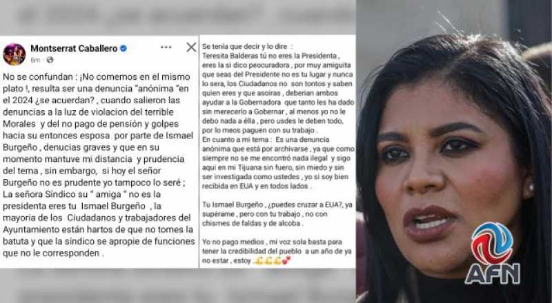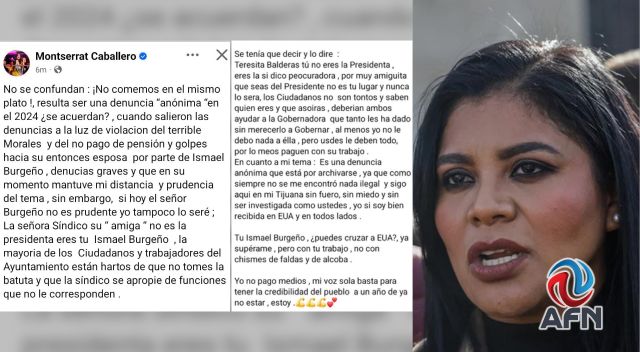 TIJUANA BC 4 DE OCTUBRE DE 2025 (AFN).- La ex alcaldesa Montserrat Caballero Ramírez arremetió de nueva cuenta en contra del presidente municipal Ismael Burgueño Ruiz, a quien acusó de no desempeñar su cargo y dejar que la síndico, Teresita Balderas Beltrán, sea quien tome decisiones por él.