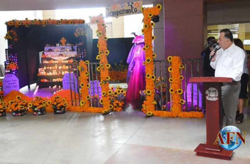 ENSENADA BC 2 DE NOVIEMBRE DE 2017 (AFN).- “Hoy celebramos una tradición mexicana: el Día de Muertos, por ello preparamos una muestra representativa de nuestra cultura, un altar dedicado a ellos, que simboliza una ofrenda para nuestros seres queridos que se nos han adelantado en el camino”, fueron las palabras del alcalde Marco Novelo Osuna durante la inauguración del altar de muertos que fue colocado en la Plataforma Cultural de la Casa Municipal.