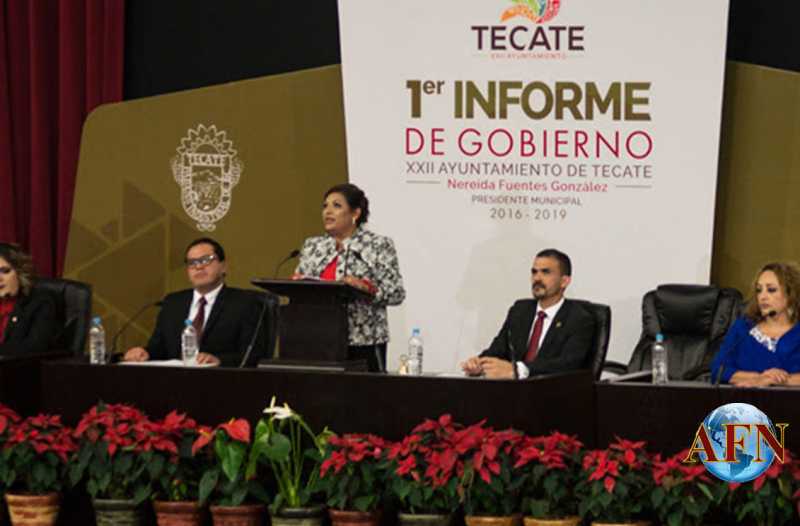 TECATE BC 2 DE DICIEMBRE DE 2017 (AFN).- La presidenta municipal de Tecate, Nereida Fuentes González, presentó el pasado jueves 30 de noviembre su primer Informe de Gobierno, que desarrolló basándose en el Plan Municipal de Desarrollo a través de sus cinco ejes: Bienestar, Equidad e Integración Social, Desarrollo Económico, Innovador y Sustentable, Desarrollo Urbano Ordenado, Administración Pública Responsable, Eficiente y Capaz, Seguridad Ciudadana.