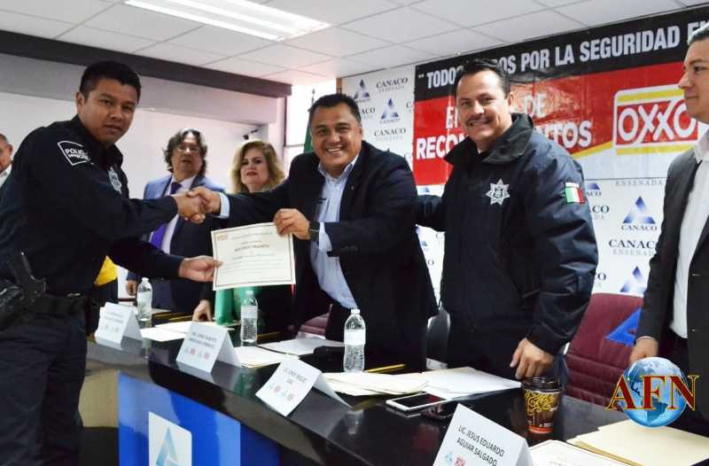 ENSENADA BC 22 DE DICIEMBRE DE 2017 (AFN).- En reconocimiento a la labor policial que con valentía se ha enfrentado a la delincuencia que ha buscado hacer daño en el Municipio, se realizó una ceremonia impulsada por las tiendas de conveniencia Oxxo y Cámara Nacional de Comercio (Canaco).