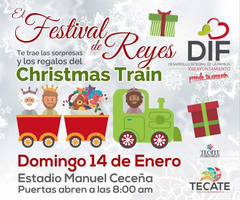 TECATE BC 7 DE ENERO DE 2018 (AFN).- El próximo domingo 14 de Enero llegará el tradicional “Christmas Train” a Tecate con motivo del Día de Reyes, para llevar sorpresas y regalos a los niños del denominado “Pueblo Mágico”, en un evento programado en las instalaciones del Estadio Manuel Ceceña, a partir de las nueve de la mañana; las puertas abrirán desde las 8 horas.