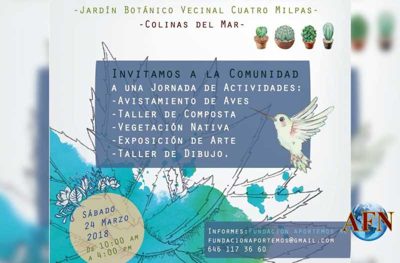 ENSENADA BC 23 DE MARZO DE 2018 (AFN).- El Jardín Botánico Vecinal Cuatro Milpas invita al evento titulado “Reconectándote con la Naturaleza” que se realizará de las 10:00 a las 16:00 horas mañana sábado 24 de marzo, donde habrá avistamiento de aves y talleres de composta, así como otras actividades de integración comunitaria.