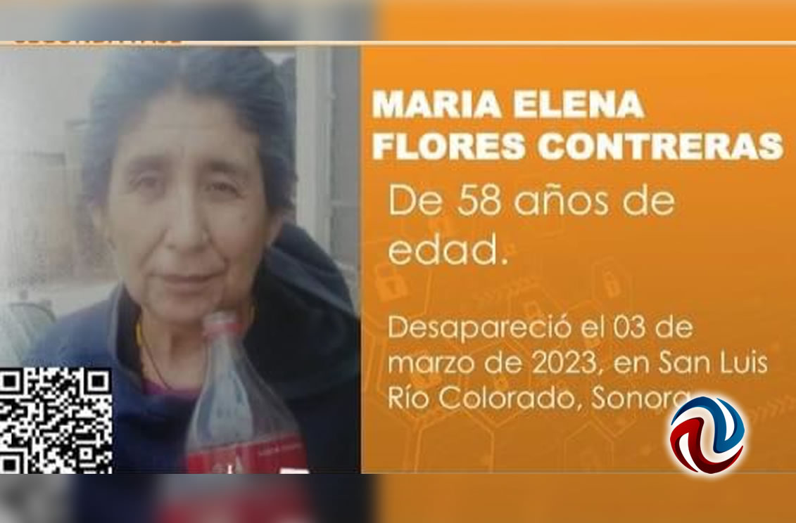 HERMOSILLO SON 30 DE MARZO DE 2023.- Una mujer de 58 años de edad, de nombre María Elena Flores Contreras, desapareció desde el pasado viernes 3 de marzo; cuando salió de su domicilio ubicado en la colonia México, en San Luis Río Colorado, por lo que la Fiscalía General de Justicia del Estado de Sonora (FGJE), activó el Protocolo Alba, para localizar a personas extraviadas o desaparecidas.