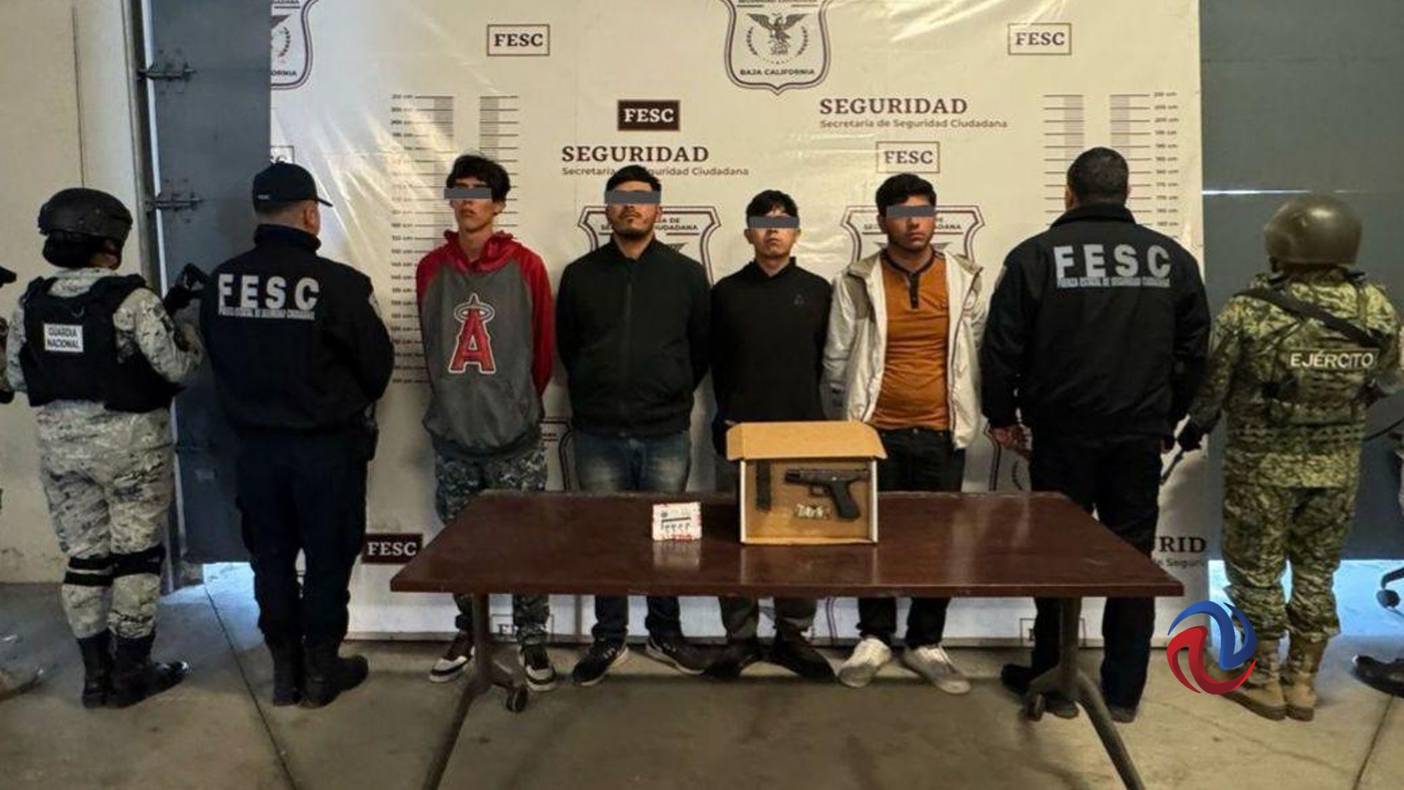 TIJUANA BC 2 DE MARZO DE 2025 (AFN).- Elementos de la Fuerza Estatal de Seguridad Ciudadana (FESC), del Ejército y de la Guardia Nacional detuvieron a cuatro hombres en el Valle de las Palmas, donde fueron sorprendidos a bordo de un vehículo en el que llevaban un arma de fuego.