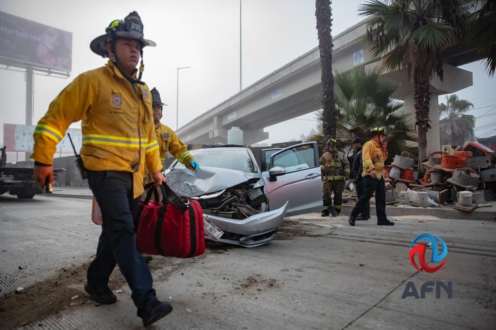 TIJUANA BC 9 DE NOVIEMBRE DE 2025 (AFN).- El conductor de un vehículo tipo sedán se impactó contra un muro estructural del Viaducto Elevado, sobre la Avenida Internacional, la mañana de este domingo.