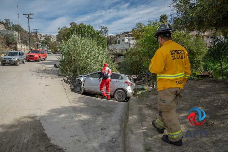 TIJUANA BC 20 DE FEBRERO DE 2026 (AFN).- Un aparatoso accidente vehicular se registró la tarde de este viernes en la colonia Chihuahua, donde un vehículo de plataforma terminó al borde de un desarenador, dejando como saldo al conductor inconsciente y una pasajera lesionada.